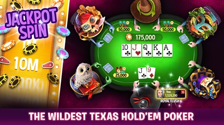 ● BIG FREE WELCOME PACKAGE: $30,000 FREE poker chips, gold and avatar hat! ● 7 DIFFERENT POKER FORMATS: Cash games, Sit & Go tournaments, Spin & Play, Heads Up Challenge, Push or Fold with Royal Poker, No-limit and Pot Limit. ● POKER TEAMS: TEAM UP AND PLAY FOR THE REWARDS Make friends and compete against other teams and check out the all-new challenges! ● PARTY POKER: PLAY WITH FRIENDS FOR FUN Invite friends and have a blast! ● ENJOY TEXAS: WESTERN GAMES OF THE WILD WEST Travel through Texas by winning poker tournaments and cash games. Beat friends at Texas Holdem poker. The further you travel, the higher the stakes! ● BLACKJACK 21: Play Blackjack with many different betting amounts. ● FREE CHIPS: Loads of free chips options every few hours! ● MISSIONS: Complete them all in every area and claim great rewards! ● WIN RINGS, BADGES & ACHIEVEMENTS: Distinguish yourself by winning rings, badges and trophies with your poker skills! ● PLAY ALWAYS AND EVERYWHERE: Play poker on your mobile device and continue to play on your tablet, web, laptop and desktop. ● BONUS FOR CONNECTING WITH FACEBOOK: Earn extra chips and play poker with friends! ● CHAT: Talk with other hold em players through chat and animated emoticons. Use them to bluff or taunt and try to take down the pot! ● CERTIFIED RNG