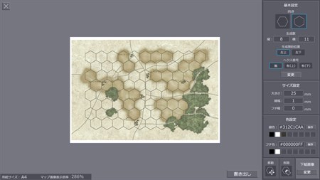 下絵の読み込み先とPDFの出力先は【ピクチャ】フォルダとなります。異なるフォルダを選択した場合、Windows側の仕様により読み込めないか、データが破損する場合がございます。また本アプリはヘクスを用いたウォーゲームのマップ用途に設計されている為、生成するヘクスの数が多すぎる場合、PC環境により生成に時間がかかるか、生成できない場合がございます事をご了解下さい。
