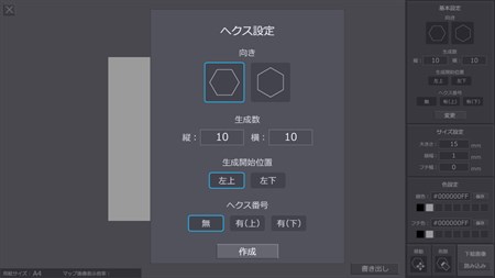 【用紙設定】 A1~A4/B2~B5/カスタム(mm) 縦/横の用紙方向 【ヘクス設定】 縦/横の向き 生成する個数 生成開始位置 【ヘクスサイズ変更】 大きさ/線幅/フチ幅 【色設定】 線色/フチ色 【その他】 全体ヘクス枠の移動 選択ヘクス枠の削除 下絵画像の読込と変更 PDF出力
