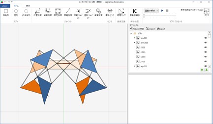 ・剛体ボディとジョイントの定義 ・運動学解析処理 ・解析結果をアニメーション表示 ・解析結果のcsvファイル出力 ・解析結果プロッター(簡易グラフ)