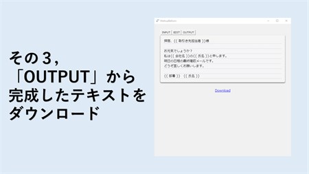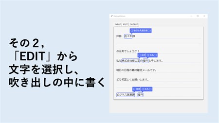 1.テキスト入力 アプリ起動時に表示される入力フォームで、「INPUT」ボタンを押す事でも表示させられます。ここではフォームに直接テキストを入力もしくはクリップボードからペーストし、対象となるテキストを作成します。 2.エディット 「EDIT」ボタンを押す事で表示され、入力されたテキストが表示されます。ここではテキストの一部をマウス操作で選択して、表示された吹き出しの中に文字を書き込むことで、最後に出力する際に書き込んだ文字を代入することが出来ます。選択箇所をもう一度選択することで解除することが出来ます。 現時点では、改行を跨いだ選択は出来ないものとなっております。 また、エディットで編集をした後にもう一度テキスト入力へ戻り内容を変更すると、エディットでの編集が無効化されてしまいます。 3.出力 「OUTPUT」を押す事で表示されます。エディットで作成したテキストがフォーム内に表示され、下部のDownload URLをクリックすることでテキストファイルをダウンロードできます。