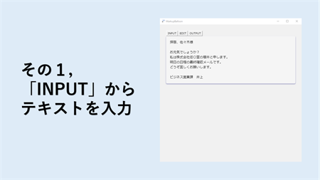 使用の大まかな流れは、 1:テキスト入力 2:エディット 3:出力 の三つに分かれております。