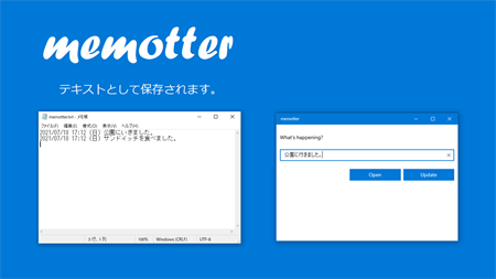 1行日記です。 日々の出来事や、思いついたことを書き込んでください。 日付と時刻とともにテキストファイルとして記録されます。