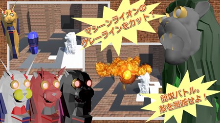 _____________________ 遊び方 _____________________ ・矢印キーでマーライオンを操作。 ・マシーンライオンのグレーのラインを通過してみよう。敵を倒すことができるぞ。 ・しかし気を付けて!マーライオンのピンクのラインを敵に通過されると…負け。 ・「 D 」キーでマーライオンが加速! ・「BIG」サインがでたら、「 C 」キーでビックマーライオンに変身。こいつむちゃ強いです。 ・あなたの倒した敵を敵図鑑で確認。コンプリートしたら画面を友達に自慢しよう!!