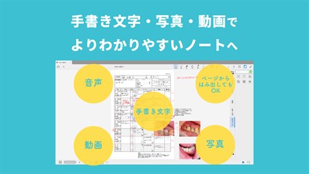 ・紙ではできないデジタルノートの柔軟性 手書き文字、テキスト文字、写真、音声、動画を1つのノートで管理ができます。また、ページ内に記入スペースがない場合でも、ページ外に手書きや写真の貼り付けができ、記入内容が分断されることはありません。