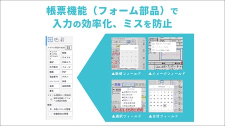 ・フォーム部品を用紙に貼り付けて、業務に最適なテンプレートを簡単に作成できます。 ・入力の効率化、語句の統一、入力のミスを防止します。