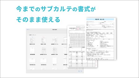 サブカルテの書式データ(PDFファイル)を取り込むことができるため、今までの紙と同じ書式が利用できます。書式データをテンプレートとして登録することで、簡単に取り出すこと(ページ追加)ができます。さらに、テンプレートには、チェックボックス、日付入力、選択入力などの設定ができ、入力の効率化、語句の統一、入力ミスを防止します。