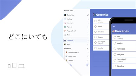 Microsoft To Do を使うと、次のことができます。 • 個人用のスケジュール帳 [今日の予定] を確認する。タスクの提案も表示されます • 場所やデバイスを問わずにリストを確認する • リストやタスクを友人、家族、同僚、クラスメイトと共有する • リストを色分けして作成する • 1 回限り、または定期的な期日やアラームを設定する • タスクを管理しやすい手順に分ける • タスクにメモを追加する • タスクに最大 25 MB のファイルを添付する • Outlook と To Do の間でタスクを同期する To Do なら仕事、学校、家庭を問わず、予定を整理して効率化できます。また、無料で入手でき、あらゆるデバイスで利用できます。