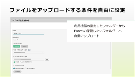 機能: -Parcelにログインせずに、ファイルをParcelのクラウド環境へアップロード。 -ファイルは、設定した条件に従って、Parcelの保管したいフォルダーに自動で格納。 -.info形式のファイルを添えてアップロードすることで、ファイルに付随する情報(例:「文書種別」、「取引日」など)をParcelへ自動で取り込み入力し、保存。