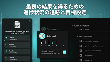 TRACK YOUR PROGRESS Monitor your progress effortlessly with the app's progress tracking feature. Gain insights into completed lessons, tasks, and knowledge checks. Additionally, set goals based on your desired learning intensity. Whether you prefer an intensive learning schedule or a more relaxed pace, customize your learning journey according to your preferences and availability. Get started on your coding journey with confidence today!