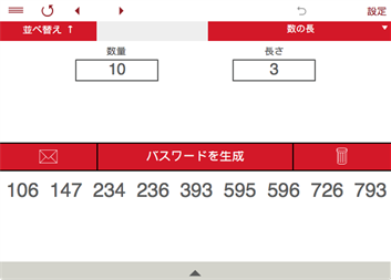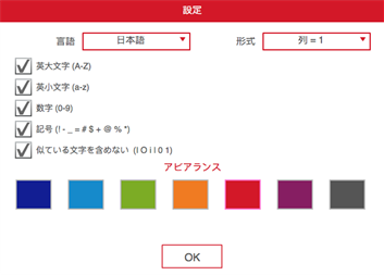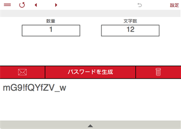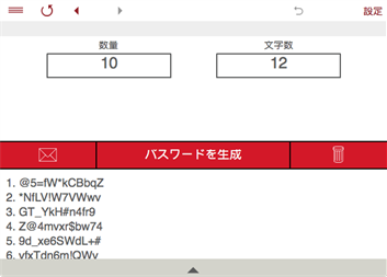 パスワードジェネレータ: • パスワードジェネレータを使用すると、大文字と小文字、数字、特殊記号を使用してパスワードを作成することができます。 • パスワードジェネレータは任意の長さのランダムなパスワードを作成します。 • 1~100桁のランダムな文字列を生成することができます。 • 紛らわしい文字を除く事も出来ます。 パスワード: 桁数: 1~100桁のランダムな文字列を。 使う文字の種類: 大文字、小文字、数字、記号。 紛らわしい文字を使わない。 • 最大200個のパスワードを生成します。