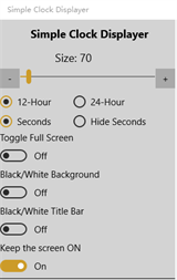 A Simple Clock Displayer with some extra nice and handy tweak able features. - Adjustable clock size - Supports 12/24 hour mode - Supports full screen mode - Supports Black/White background - Supports Keep screen on --- Completely free + No advertisements! ---