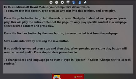 Convert text to speech by typing or pasting text in the designated textbox or from selected text in the built-in web browser. You can then save the audio into WAV format.