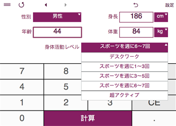 あなたの運動量レベルは次のうちどれぐらいですか? 身体活動レベル (レベル1~5) : - ほぼ動かない(ほとんど、または全く運動をしない 、デスクワーク)。 - ちょっとアクティブ(週1~3回軽いエクササイズやスポーツ)。 - アクティブ(適度なエクササイズやスポーツを週3~5回)。 - かなりアクティブ (激しい運動やスポーツを週に6〜7回)。 - 超アクティブ(毎日ハードなトレーニング/仕事も肉体労働系)。