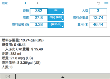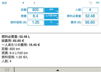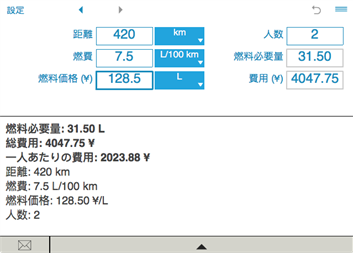 距離、平均燃費(km/L、L/100 km、mpg US、mpg UK)と燃料価格を入力してください。 乗客の数を入力することもできます。電卓は乗客1人当たりの費用を計算します。