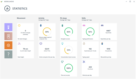 WORK & MOVE is the personal coach that ensures sufficient alternation between concentrating on monitor work and both mental and physical movement. This software provides insight and feedback on how computer work is carried out. The software recommends an optimised work-move-rest rhythm on the basis of personal needs, and helps to adapt to this rhythm. By including periodic mental and physical movement breaks, the employee can maintain better concentration and energy, resulting in fewer errors and improved quality of work. WORK & MOVE ensures that the employee is more productive throughout a working day. WORK & MOVE comes standard with a 30 day trial license. If you have a production license you can select it after installation.