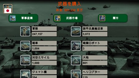 ゲーム内の武器: 傭兵、装甲兵員輸送車 (APC)、戦車、大砲、対空ミサイル、ヘリコプター、戦闘機、船舶、潜水艦、戦闘ロボット、無人航空機 (UAV)、航空母艦、弾道ミサイル。