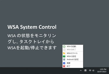 「Android 用 Windows サブシステム」の状態をモニタリングしたり、 WSAを起動/停止したりできるシンプルなタスクトレイアプリです。 右クリック(コンテキスト)メニューから、WSAの設定アプリ 及び ファイル(Android) アプリを起動する事ができます。