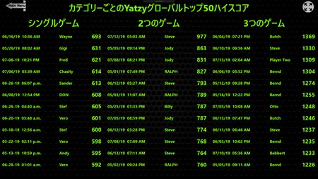 Yatzyは一種の5つであり、最初のYatzyに50ポイント、同じゲーム列に追加のYatzyごとに100ポイントを与えます。