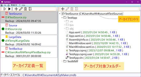 ZipMakerは、特定のフォルダーの特定のファイルのみを選択してzipアーカイブファイルを作成するプログラムです。 アーカイブするファイルの指定は、アーカイブ定義としてデータベースファイルに保存されます。 アーカイブするファイルは簡単な操作で指定できます。 作業の成果物を顧客に納品する場合、作業フォルダーの特定のフォルダーとファイルのみを抽出する必要があります。 このような場合、一旦、アーカイブ定義を作成しておけば、いつでも簡単に納品物件が何度でも作成できます。 また、バックアップファイルを作成する場合にも使用できます。