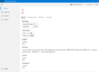 The 101dict Chinese Dictionary is a dictionary with more than 200,000 entries. It supports English, German, French, and Hungarian translations based on the free dictionaries CC-CEDICT, HanDeDict, CFDICT, CHDICT, and CC-Canto. In addition, HSK and TOCFL vocabulary lists can be browsed. For Chinese characters, stroke order animations and Unihan information are available.