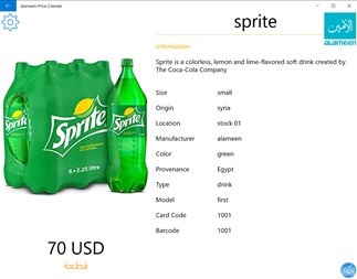 It is an application that is used within the shopping store to allow the customers to check product's price or product's information with a secure lock password. This application is an extension for Al-Ameen Business Solutions ERP System. The app allows the user to read the barcode through a barcode scanner or entered it manually. It displays ads pictures when it’s in idle state. The application allows the user to get detailed information about the scanned product such as color, size, product’s image, detail description, price and much more.