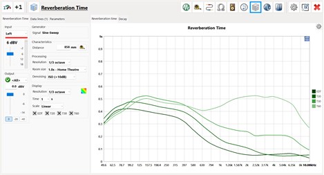 With the simultaneous measurement of volume and distortion, the DSP is controlled to avoid digital and analog clipping, the basis for distortion-free sound. When correcting the room with the DSP, the waterfall diagram shows the correct setting and optimization. By the cosine burst measurement resonances, modes, and reflections are shown distinguishable. This is important to be able to design and decide acoustic tuning measures correctly by distinguishing resonance and reflection.