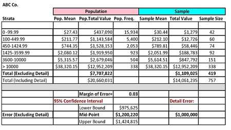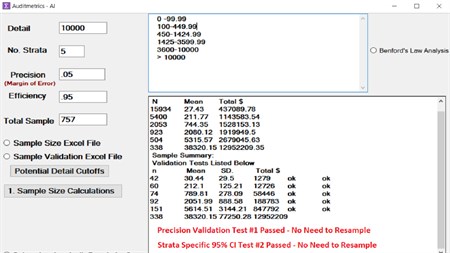 Auditmetrics has recently expanded data input potential by adding an ability to input data from standard reports that many accounting management systems such as QuickBooks offer. It then can provide a complete analytical framework from auditing cashflow to forecasting revenue and expenses. All of this is done in a user-friendly environment such that one can traverse the complexity of the statistical audit by using a simple three step process. Each step has a series of computer guided analytic checkpoints. An auditor can let the software establish sample specifications but there is ample opportunity for the auditor to fine tune the final design. Once a design is accepted, a random sample of the account is generated. The AI system also generates Excel templates that can be used to document and record audit results.