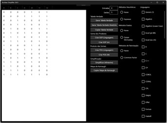 * Manage truth tables of expressions with up to 26 logic inputs; * Generate truth tables with random outputs; * Create Karnaugh maps from generated truth tables; * Conversion of Boolean expressions to 64 different types of Boolean logic language; * Create expressions in POS (Product of Sums) or SOP (Sum of Products) format; * Create expressions in Minterms or Maxterms format; * Simplify expressions using heuristic methods, exact or through factorization methods; * Combine different simplification methods to obtain expressions, smaller and in less time.