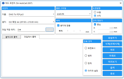 도면폼과 파일의 출력 순서를 설정할수 있으며 프린트 기기, 용지, 방향, 축척등을 이용하여 대량의 출력을 손쉽게 이용할수 있게 만들어졌습니다.
