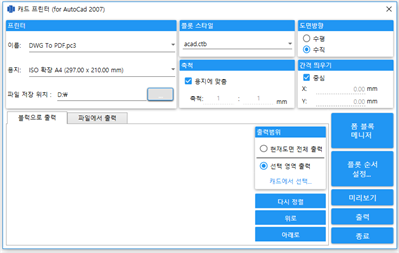 AutoCad의 출력 보조 프로그램으로 블럭 폼을 이용하여 출력을 하거나 파일을 이용하여 출력할수 있습니다.