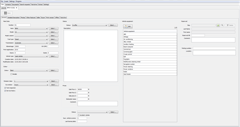 Each vehicle can have sale and purchase info, detailed information on buyers and sellers, as well as prices and terms of sales contracts. All basic data of the selected vehicle can be printed or saved as PDF.