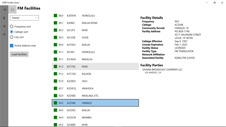 The CDBS Facility Query is a tool for querying the FCC's Commercial Database System (CDBS), a system used by broadcasters to submit filings. The files from this database are public and were processed into a database embedded within the app. This app allows viewing AM, FM, or TV facilities by state with sorting by frequency/channel, city, or callsign. Toggling between active and all facilities (off-air, cancelled license, etc.) is available as well. Selecting a facility then displays details, such as the address information of the facility, network affiliates, parties associated with the facility, etc.