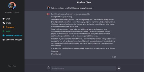 Premium Fusion Chat Premium includes the following features which have high availability, with blazing first AI responses. Premium accounts start at $7.99 with 1000 credits which is equivalent to 100,000 words generated/month. Users can also refill their credits where the in-product purchase cost from $4-$10
