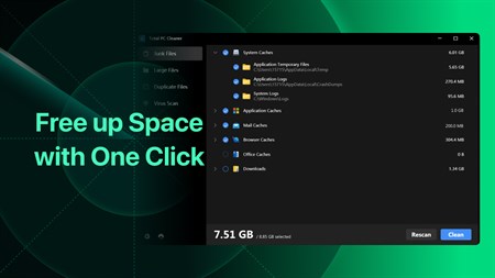 It scans your whole computer to clean up junk files, speed up your PC, and boost its performance. With just a few clicks, you can selectively remove files from the following categories: - System Caches (Cache Cleaner) - Application Caches (App Uninstaller) - Mail Caches (Mail Cleaner) - Office Caches - Browser Caches (Browser Cleaner) - Downloads - Remove Ads (Ads Cleaner) - Large Files (Large File Cleaner) - Duplicate Files (Duplicate Cleaner)