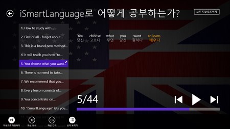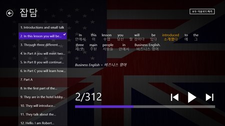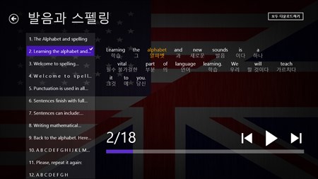 어플리케이션 내용: * 2.5 시간의 음성 녹음 * 2793 특이 단어(어휘) * 전체 9 레슨, 2077 문장, 22729 단어