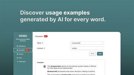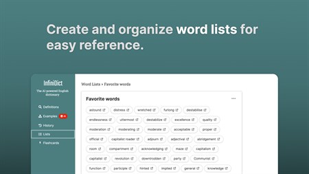 - Lightning-fast definition search: Get instant results for any word, complete with detailed definitions, example sentences, variations, and audio pronunciations. - Synonym search: Search synonyms with both semantic and grammatical similarities in our AI-powered thesaurus. - Real-life usage examples: Our expansive database of sentences, powered by AI, illustrates how words are used in actual contexts, enriching your vocabulary and language proficiency. - Automatic search history: Effortlessly track words you've looked up with our auto search history feature, and revisit definitions or examples whenever needed. - Word lists: Conveniently organize words you're learning or wish to review later using our user-friendly word lists, which can be categorized by topic, difficulty, or any custom criteria. - Customizable flashcards: Enhance your vocabulary learning with our personalized flashcards. Craft your own sets and quiz yourself on definitions, spelling, and more. - Data sync across devices: Experience seamless synchronization of your search history, lists, and preferences across all devices - be it a phone, tablet, or computer. - Infinite storage: Never fret about storage limitations for your word lists, flashcards, or search history. Access everything you need, anytime, with boundless storage. - Ad-free premium plan: Opt for our premium plan to enjoy an uninterrupted, ad-free experience while expanding your vocabulary.