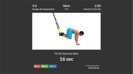 ★ Choisissez les activités que vous souhaitez faire, ainsi que l’ordre d’exécution. ★ Définissez la durée de repos entre chaque activité. ★ Pour chaque catégorie, sélectionnez les exercices, le temps de repos qui les sépare, leur ordre d’apparition, la durée d’effort, la difficulté et le nombre de séries. ★ Un signal sonore vous indique systématiquement la fin de chaque série et de votre séance.