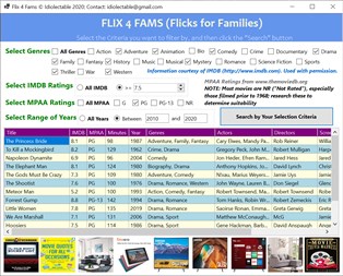 Flix 4 Fams ("Flicks for Families") allows the user to select from the following criteria to filter a from a database of almost half a million movies: Genre, MPAA Rating (suitability), IMDB Rating (popularity), and Range of Years. Clicking on a movie's row in the list generated in the grid will display a button which they can click to allow them to choose whether to rent or buy that movie (or one that may be similar to it, if a movie with that title is not found on amazon.com)