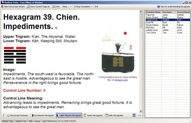 Working with the program, you get personal birth chart based on I Ching (Chinese Book of Changes) which represents a figured description of forces and influences following you during your lifetime.