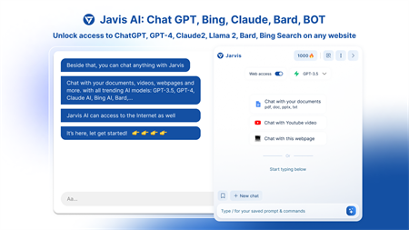 ???? Quick Start Tips: 1️⃣ Focus on your input text like using Grammarly to activate Jarvis AI Assistant. 2️⃣ Highlight any text on a webpage, and Jarvis will empower you to gain a deeper understanding of it. Whether you want a detailed explanation, a flawless translation (translate), or an insightful paraphrase, Jarvis skillfully leverages the power of various advanced AI models, including the versatile GPT-3.5, the cutting-edge GPT-4, the interactive Chat GPT, the innovative Claude AI, the exceptional Llama 2, the creative Bard, the efficient Bing Chat, the deep-learning Meta AI, the transformative Ajax AI (also known as AjaxAI), and, of course, the remarkable OpenAI technology. With Jarvis at your side, you have an entire arsenal of AI capabilities to enhance your understanding of text and information. 3️⃣ Utilize the Prompt Library for conversation inspiration. 4️⃣ Get video summaries and generate outlines on YouTube effortlessly.