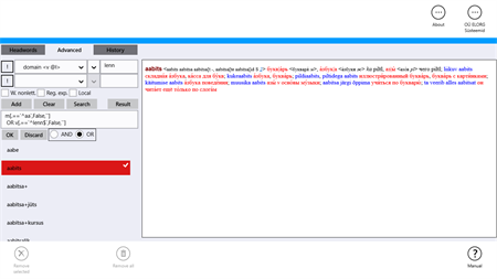 Estonian-Russian dictionary. Saves history of the viewed articles. Works also with Windows built-in search. Advanced search enables search on all article attributes. Detailed instructions for using product on the Help page. Live tiles present headwords and their equivalents.
