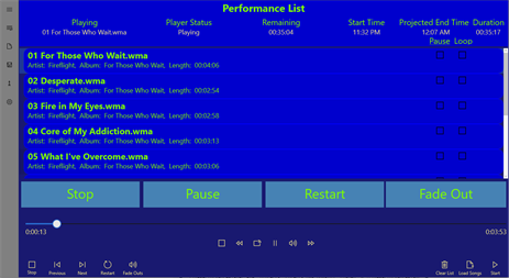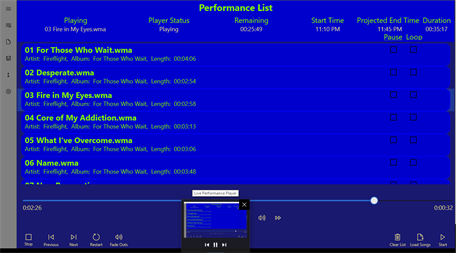 Live Performance Player is designed to manage the playback of cover-tracks and other audio music during live performances taking the burden away from the engineer/performer. Set your line-up and let the player do the rest.
