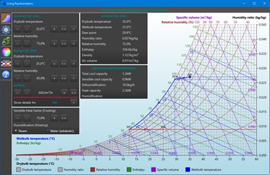These four calculations show the results in a pane, but also graphically in a diagram. You can choose between three different diagrams: 1. Psychrometric This is the classic diagram representing different kinds of air properties into a single diagram. You find detailed descriptions in standard books about air treatment, such as ASHRAE. This diagram shows lines of constant temperature, humidity ratio, relative humidity, enthalpy and specific volume.