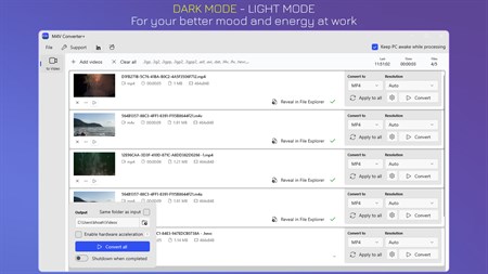 • Enable hardware acceleration to save time. • Auto shutdown when completed. • Save time with multiple files processed at once or focusing on a single video. • Keep PC awake while processing.