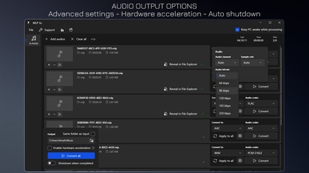• Enable hardware acceleration to save time. • Auto shutdown when completed. • Save time with multiple files processed at once or focusing on a single audio.
