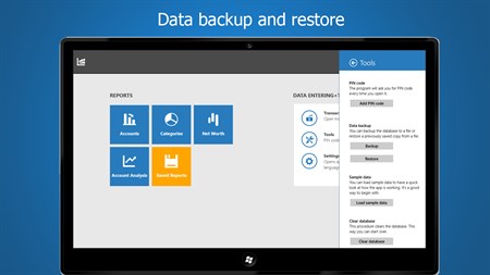 With Moneygraph you can: - Create and manage multiple accounts - Make transfers between accounts - Create reports (default templates include account analysis, net worth, categories, accounts) - Customize and save reports - Create custom categories - Create backups so you never lose your data - Sync data across multiple devices via OneDrive - Protect your sensitive data with a pin-code