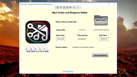 How to use Mp3 Cutter and Ringtone Maker: 1.Select mp3/music from your pc or from Recordings. 2.Enter the start and end Time to be chopped from your audio. 3.Save as Ringtone/Music/Alarm/Notification.
