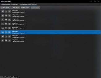 Manual Mode: Drag and drop music files from windows explorer to the application window to create playlists. You can re-order the songs using drag and drop as well. Save the playlist file when you are satisfied. You can open previously created playlist files to edit them as well.
