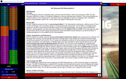 Mustang Sales Brochures 1964 -2021 is a comprehensive collection of Mustang sales brochures that chronicle the incredible history of America's favorite "Pony Car". Every page of each piece of literature allows you to zoom in to read all the details for each year. Check out the colors, the specifications, options, photos, sales pitches and much more as presented in each catalog. A must have for any Mustang owner or enthusiast!